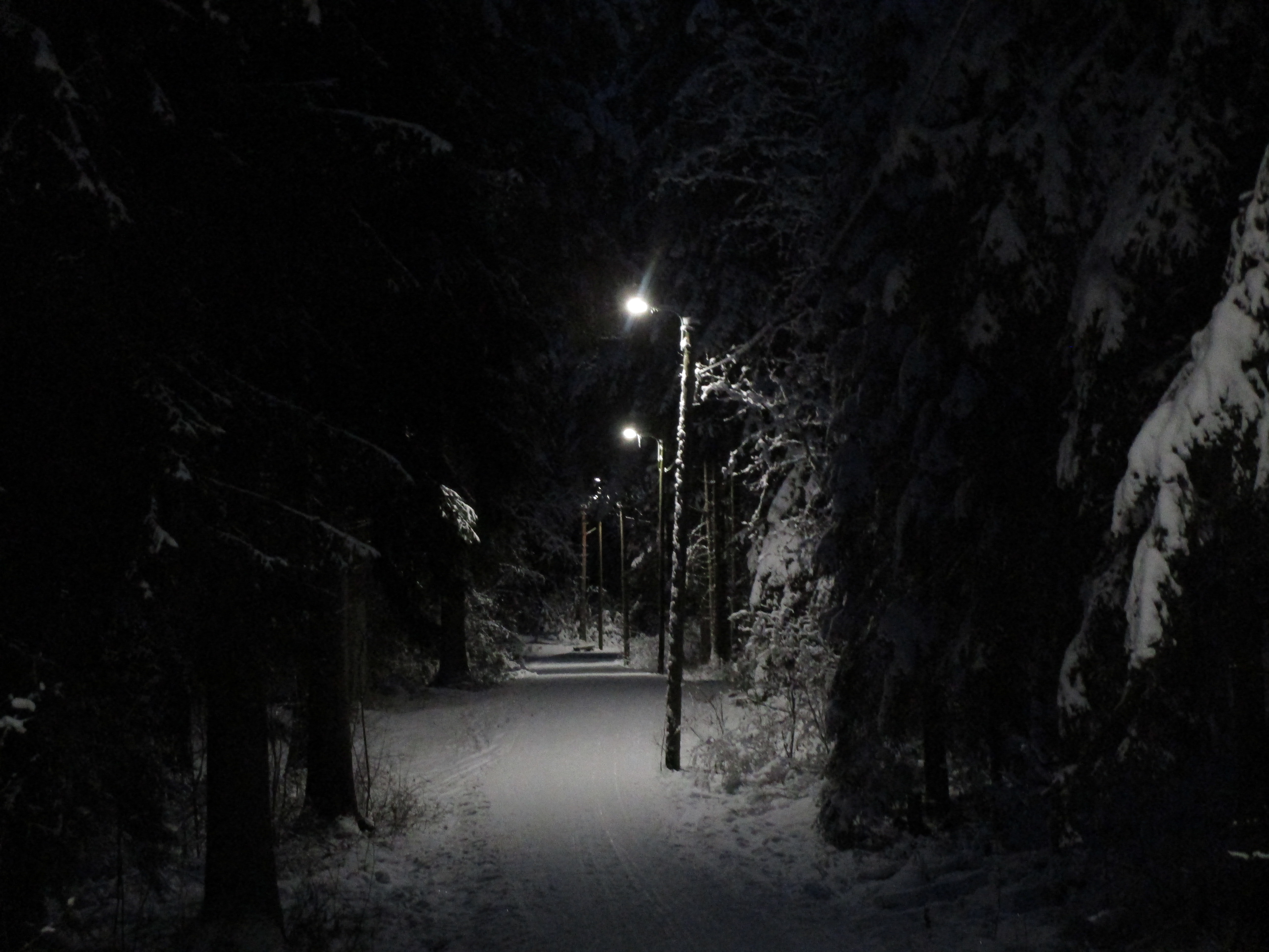Paikallislehti kertoi, että järveä kiertävä latupohja oli jo valmiina ja sitä olikin helppo kävellä. Askelista ei juuri jäänyt jälkeä kovaan väylään. Nyt kun lunta oli luvassa lisää oli tämä suunnilleen viimeinen ilta kulkea jalkapatikassa lutakon ympäri. Latukoneet oli varmaan jo valmiiksi tankattu ja nokat käännetty oikeaan suuntaan.