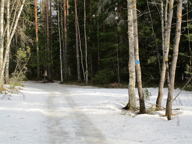 Tauluntien jäiseltä parkkipaikalta suuntasimme sinisiä ja keltaisia opasteita seuraten metsäpolulle. Täällä olikin yllättävän liukasta. Polku oli talven aikana tallautunut kovaksi jääksi eikä kevätaurinko vielä yltänyt tänne asti.