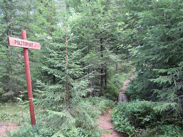 Kävelimme monimuotoisessa metsässä ja välillä myös pieniä pätkiä soratiellä. Aurinko pilkahteli pilvien takaa ja tyyni ilma villitsi hyttysiä.