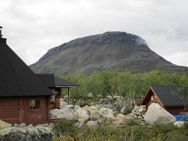 Tästä olisi voinut jatkaa matkaa järven rantaa pitkin vaikkapa Haltille asti, mutta me käännyimme alamäkeen kohti Kilpisjärveä. Se takana kohosi Ruotsin puoleisia tuntureita.