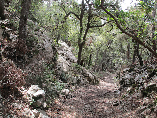 Pitkähkön ja huimaavan tähyilyn jälkeen laskeuduimme alemmaksi ja lähdimme metsäpolkua kohti Cas Garrigueria. Siellä pidettäisiin evästauko. Tästä alkoi luvattu pitkä alamäki. Kyllä kelpasi.